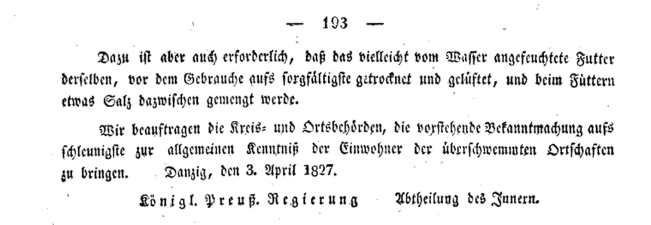 Afbeelding: uit het Amtsblatt van 1829, vermelding van maatregelen na overstroming